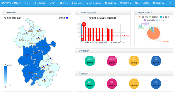 冠新診療行為平臺采用獨有的數據挖掘技術以及違規行為智能預警機制,監管醫生及醫院對患者進行的各種檢查、診斷、用藥、護理、康復等診療行為,防止醫生及醫院超范圍用藥、大檢查、大處方等違規行為。