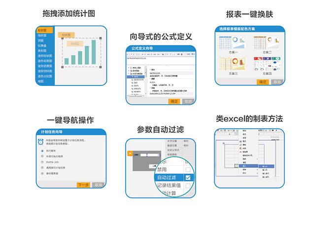 純Web的報表設計器,類Excel的操作方式,所有操作無需定義復雜公式,僅需拖拉圖表、參數(shù),指標拾取即可快速完成各類報表。