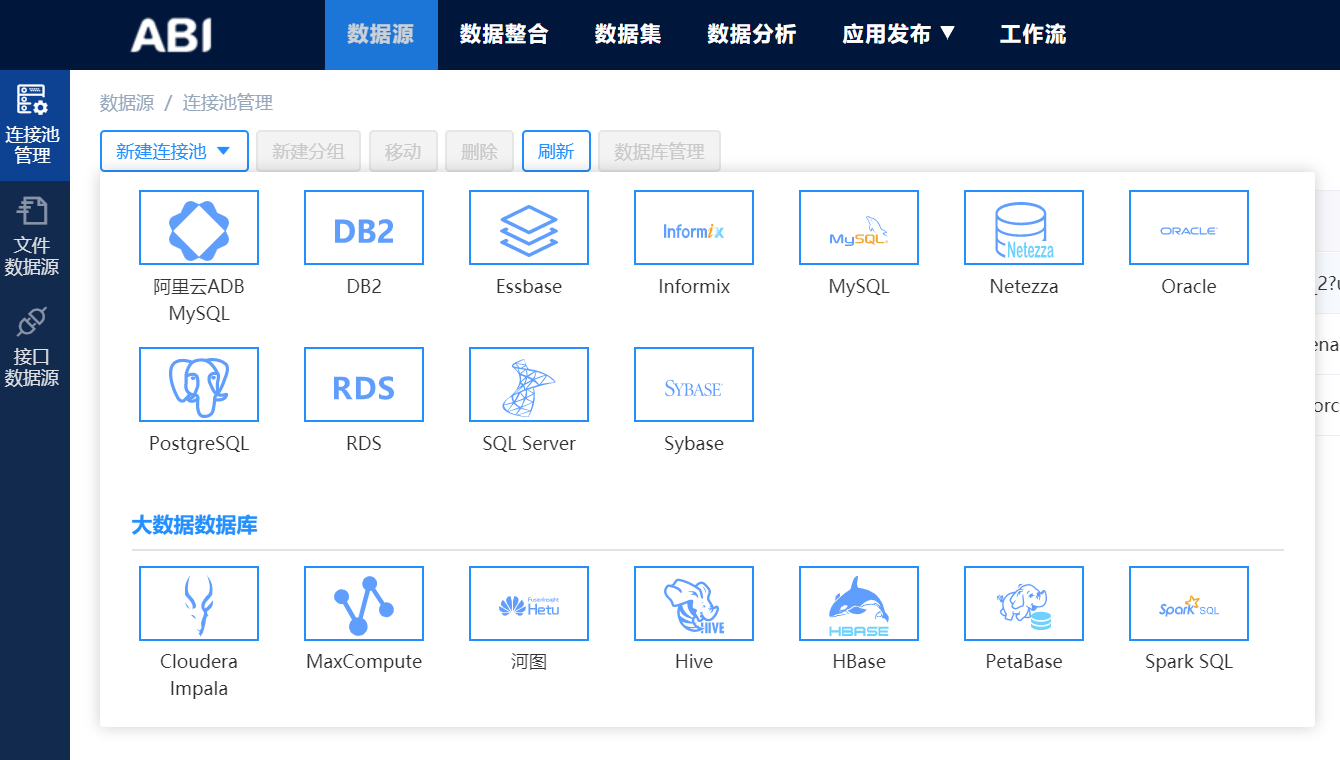 億信ABI支持對(duì)接包括:Mysql、Oracle、SQL Server、DB2、GBase、PetaBase、Essbase等多種數(shù)據(jù)庫(kù),而且還支持各種其他類型文件的導(dǎo)入數(shù)據(jù),包括excel、txt、csv、db等等文件。