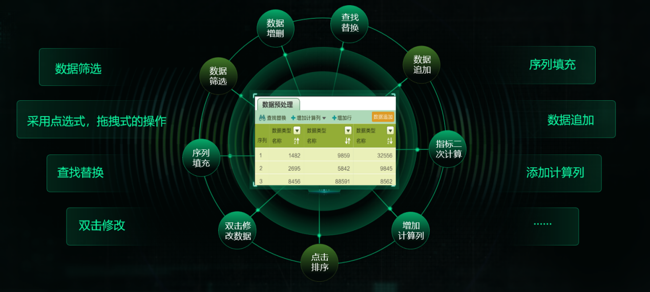 對于接入系統(tǒng)的數(shù)據(jù),通過點(diǎn)選式的方式進(jìn)行去除重復(fù)行、空值替換、數(shù)據(jù)裁剪、數(shù)據(jù)脫敏、類型轉(zhuǎn)換等復(fù)雜的數(shù)據(jù)處理操作,并且能進(jìn)行圖形化界面多表關(guān)聯(lián)。