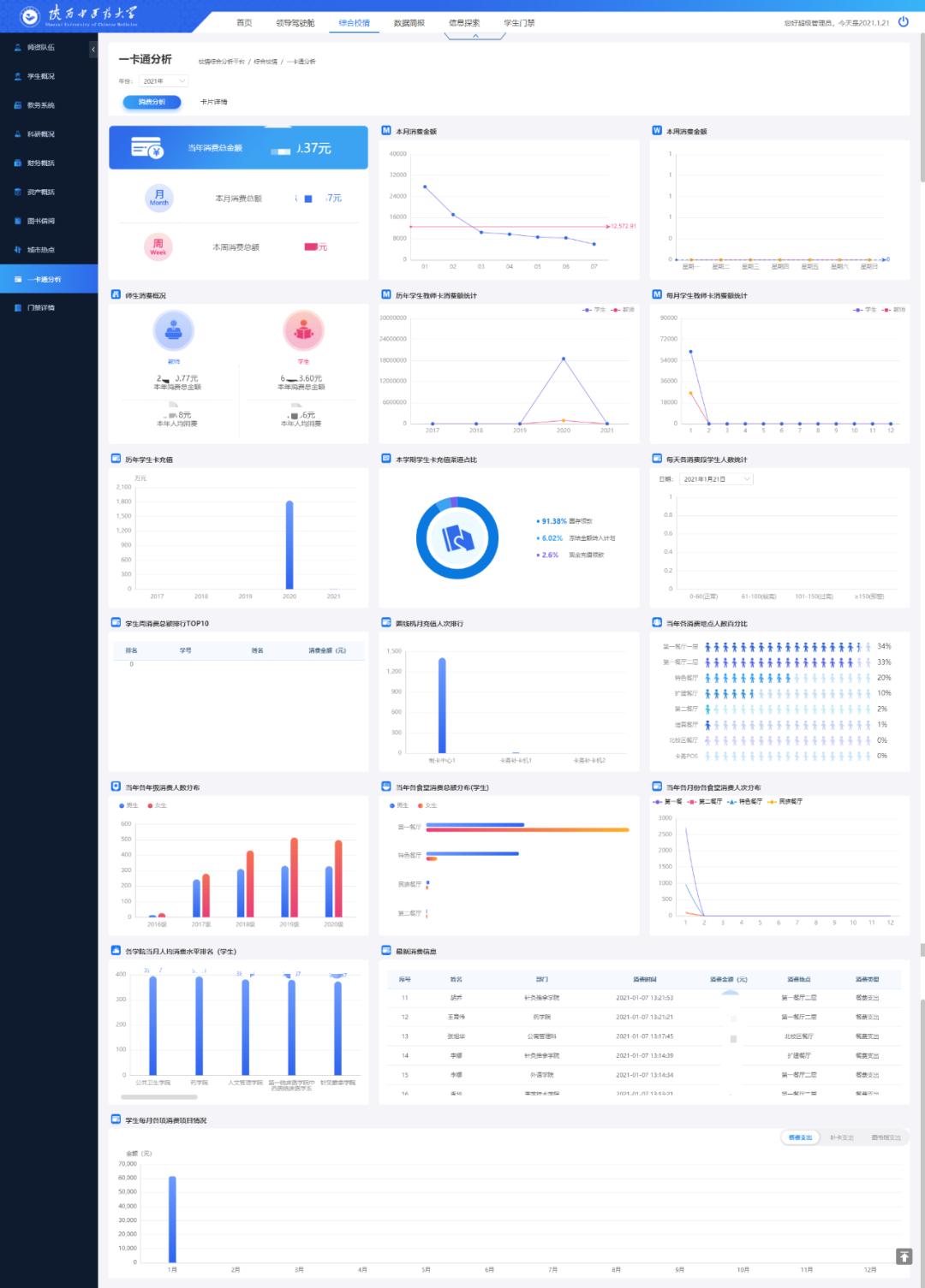 一卡通分析頁面通過對全校師生消費和卡片進行分析,可以讓學校管理者對在校師生的消費情況和規律有一個量化的認識,從而能夠合理地分配資源,降低管理成本,這對校園的規劃建設和學校學生管理工作都具有重要的作用。如下圖: