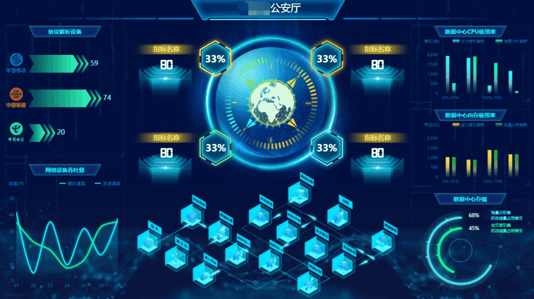 主視覺圖表作為大屏的視覺中心,一般放在中間位置,用于呈現核心指標和重要信息,通常帶有炫酷的動效,給人帶來視覺的震撼效果。
