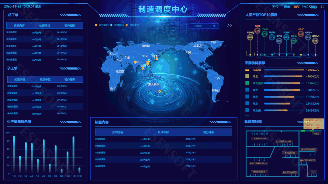 —TOP 4— 制度調度大屏 最佳分辨率:1920*1080 使用場景:工業4.0時代,制造業也開始積極響應產業數字化的號召,融合大數據分析、3D地圖等技術,構建體系先進、功能強大、場景豐富的制造調度指揮系統,滿足了生產調度、應急指揮、遠程指揮、綜合決策以及企業宣傳等多種應用場合。 展現邏輯:通過世界地圖一覽在建及歷史項目的運轉狀態,方便售后維護;另外對于制造中心內的總工單、子工單、物料消耗、人員產能等指標進行充分直觀地展現。