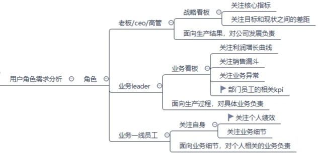 數據看板是公司內所有人員都會關注的,無論是公司高層還是基層業務操作者都會關注相關的數據指標。只是不同的角色的需求不同,如下圖:
